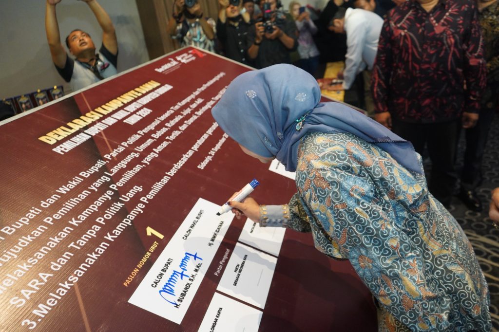Usai dibacakan, naskah deklarasi ditandatangani para pasangan calon Bupati dan wakil Bupati, perwakilan partai politik dan unsur forum pimpinan daerah (Forkopimda), Ketua KPU Sidoarjo Fauzan Adim, Ketua Bawaslu Kabupaten Sidoarjo Agung Nugraha SH. Sp