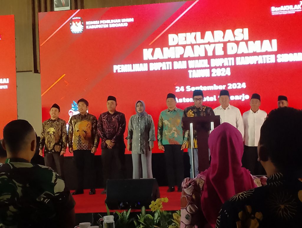 Naskah Deklarasi Pilkada 2024 dibacakan oleh Ketua KPU Sidoarjo Fauzan Adim diikuti seluruh peserta yang sudah melakukan pengundian nomor urut pasangan calon (paslon) Bupati dan wakil Bupati pada Senin (23/9/2024), dimana Pasangan ( BAIK ) nomor urut 1 H.Subandi S. H, M.Kn – Hj.Mimik Idayana serta Bupati dan Wakil Bupati ( SAE )nomor urut 2 H Achmad Amir Aslichin S.H, B.PD,B.PC – H. Edy Widodo pada Pemilihan Kepala Daerah (Pilkada) serentak 27 November 2024.