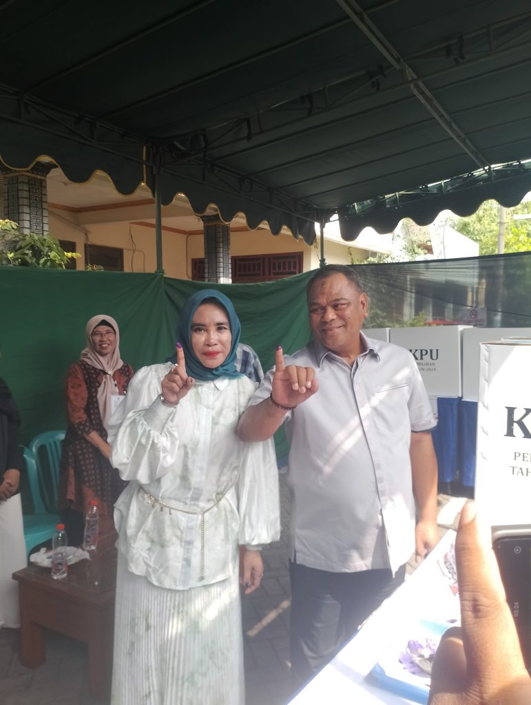 Mereka berangkat menuju TPS langsung menyalami warga yang hadir dan diteruskan menggunakan hak pilihnya.