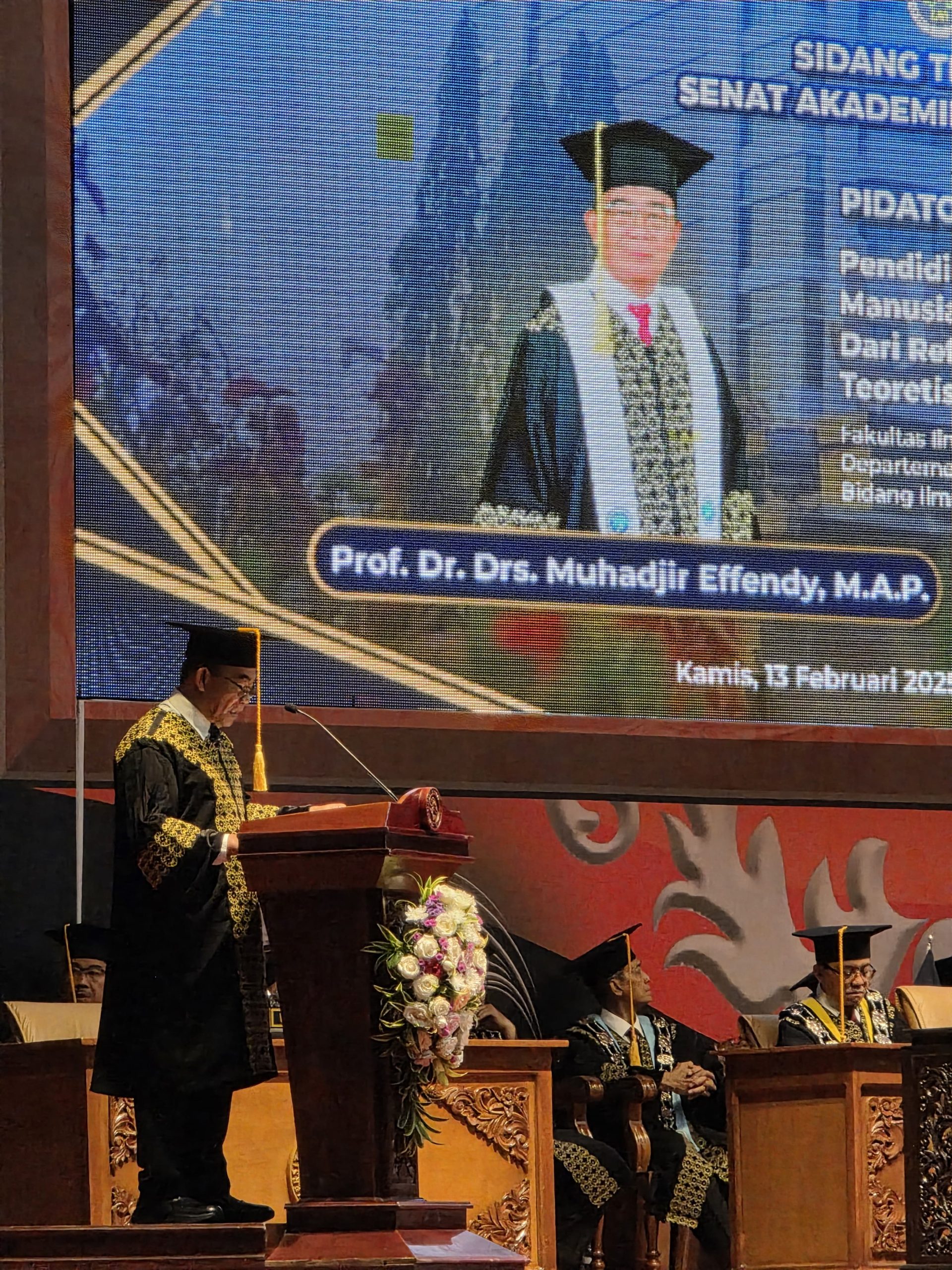Ketua Pimpinan Pusat (PP) Muhammadiyah ini menyampaikan pidato pengukuhan berjudul, “Pendidikan sebagai Pilar Pembangunan Manusia Menuju Indonesia Emas 2045 Dari Refleksi Empiris ke Konseptualisasi Teortis”.