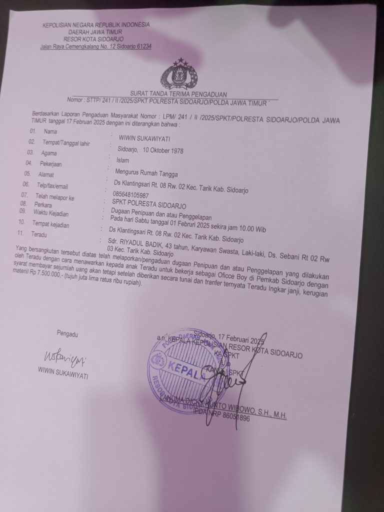 Kepada Wiwin, pelaku mengaku sebagai orang terdekat Wakil Bupati terpilih Hj Mimik Idayana. Sehingga korban percaya saja, kemudian korban kembali menyetorkan uang hingga total Rp 7,5 juta rupiah.”Riyadi Badik membawa kwitansi dan materai, untuk pelunasan uang dari saya. Saya dijanjikan oleh Badik, anak saya diterima tanggal 24 Februari 2025,” jelas Wiwin Sukawiyati.