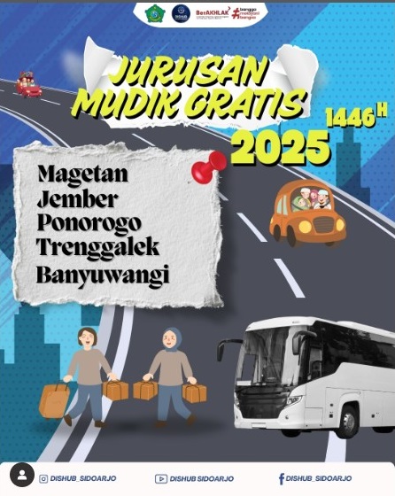 Zonajatim.com, Sidoarjo – Pemkab Sidoarjo kembali memberikan layanan mudik gratis untuk masyarakat pada lebaran tahun ini. Pendaftarannya sudah dibuka mulai tanggal 3 Maret 2025.