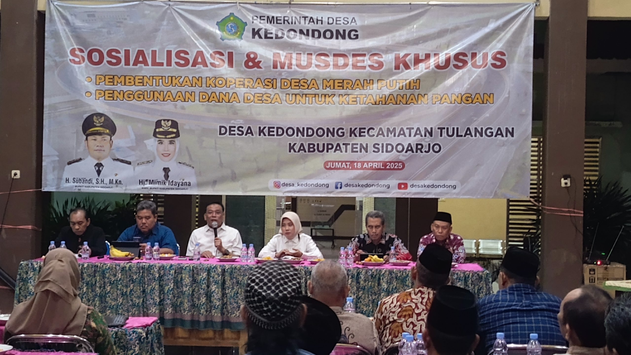 Hal itu disampaikan Wakil Ketua DPRD Sidoarjo H Kayan dan anggota Komisi D DPRD Sidoarjo dr Irda Bella saat acara sosialisasi pembentukan Koperasi Merah Putih di Desa Kedondong Kecamatan Tulangan, Jumat (18/4/2025) malam yang dibuka Wabup Hj Mimik Idayana.