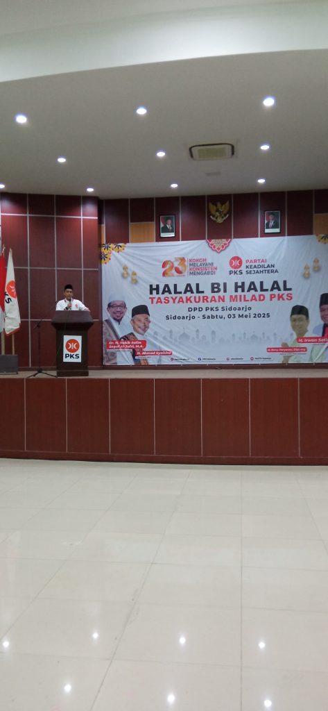 Zonajatim.com, Sidoarjo — Di tengah tantangan ekonomi dan dinamika politik nasional pasca-Pemilu 2024, DPD PKS Sidoarjo menggelar acara Halal Bihalal dan Milad ke-23 PKS sebagai momentum memperkuat konsolidasi anggota dan memperluas pelayanan masyarakat. Bertempat di Gedung Serbaguna Puspa Lebo, Sabtu (3/5/2025). Acara ini dihadiri ratusan anggota pelopor dan struktur PKS se-Kabupaten Sidoarjo.