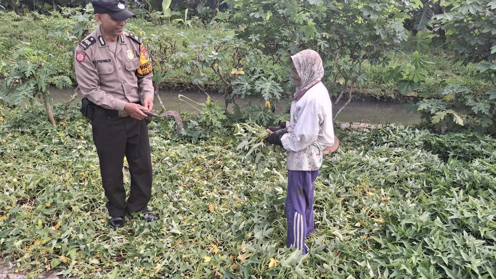 Dalam kesempatan tersebut, Aiptu Dadang Purwadi berdialog santai dengan para warga mengenai langkah-langkah perawatan tanaman singkong agar tumbuh secara optimal. Kegiatan ini merupakan bagian dari upaya mendukung program ketahanan pangan yang dicanangkan di wilayah Desa Karangpuri.