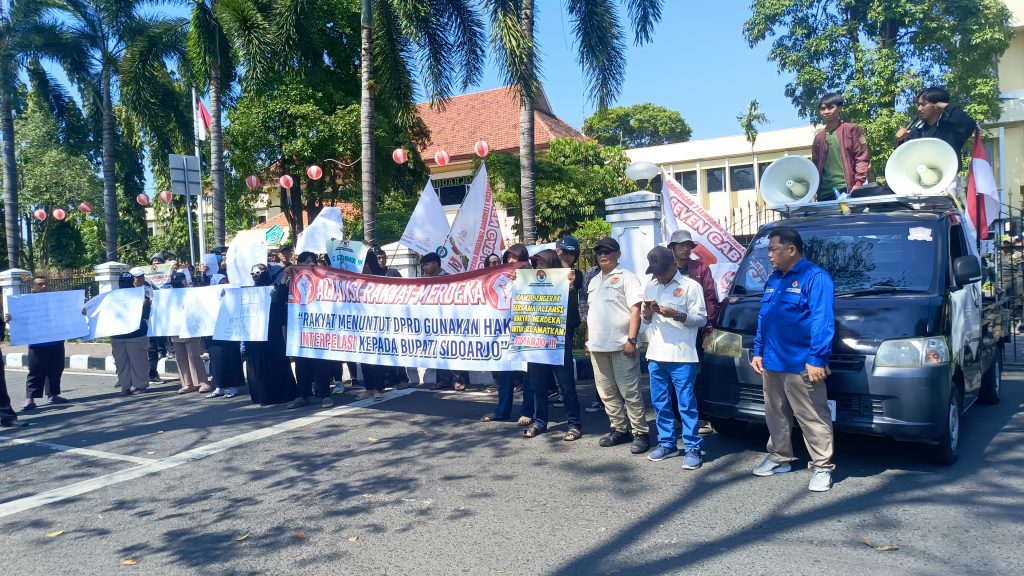 Zonajatim.com, Sidoarjo – Puluhan aksi massa dari Aliansi Rakyat Merdeka Sidoarjo yang terdiri gabungan LSM Seven Gab, JCW serta massa lainnya menggelar demo ke Kantor Pemkab dan DPRD Sidoarjo, Kamis (24/7/2025).