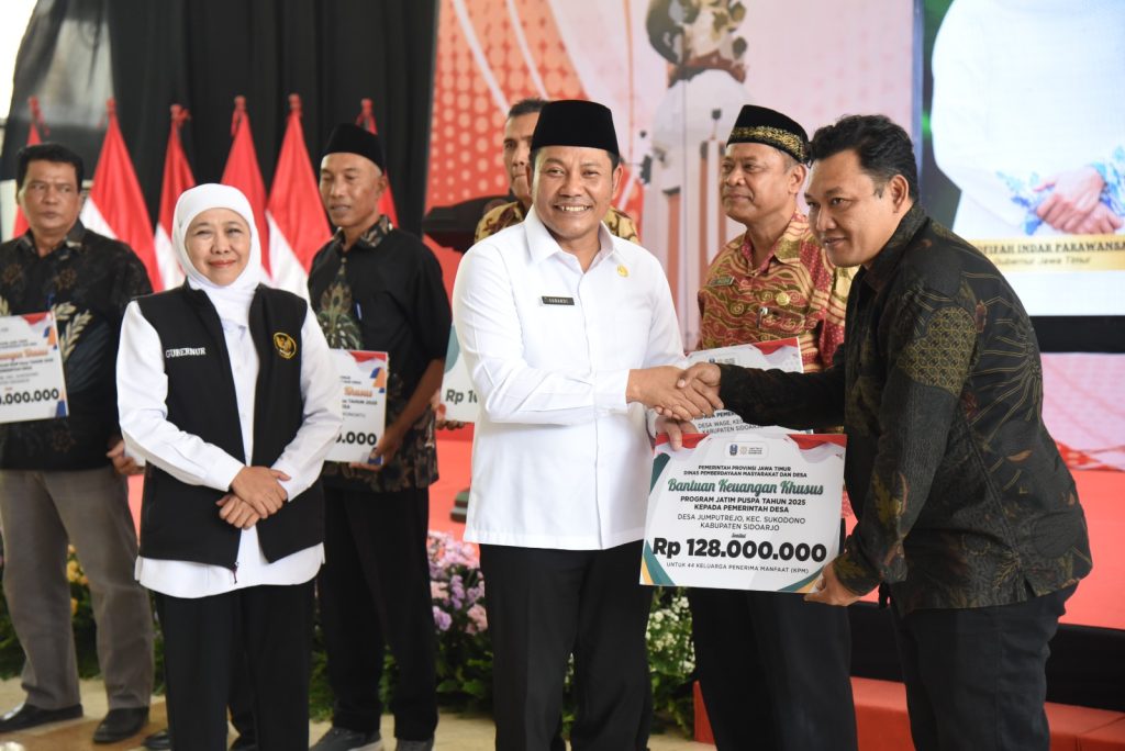 Zonajatim.com, Sidoarjo – Ribuan masyarakat Sidoarjo menerima beragam bantuan sosial (bansos) dari Pemprov Jatim dengan total nilai mencapai Rp 4.914.099.600. Penyerahan secara simbolis dilakukan oleh Gubernur Jawa Timur Khofifah Indar Parawansa bersama Bupati Sidoarjo Subandi di Pendapa Delta Wibawa Sidoarjo, Jumat (22/8/2025).
