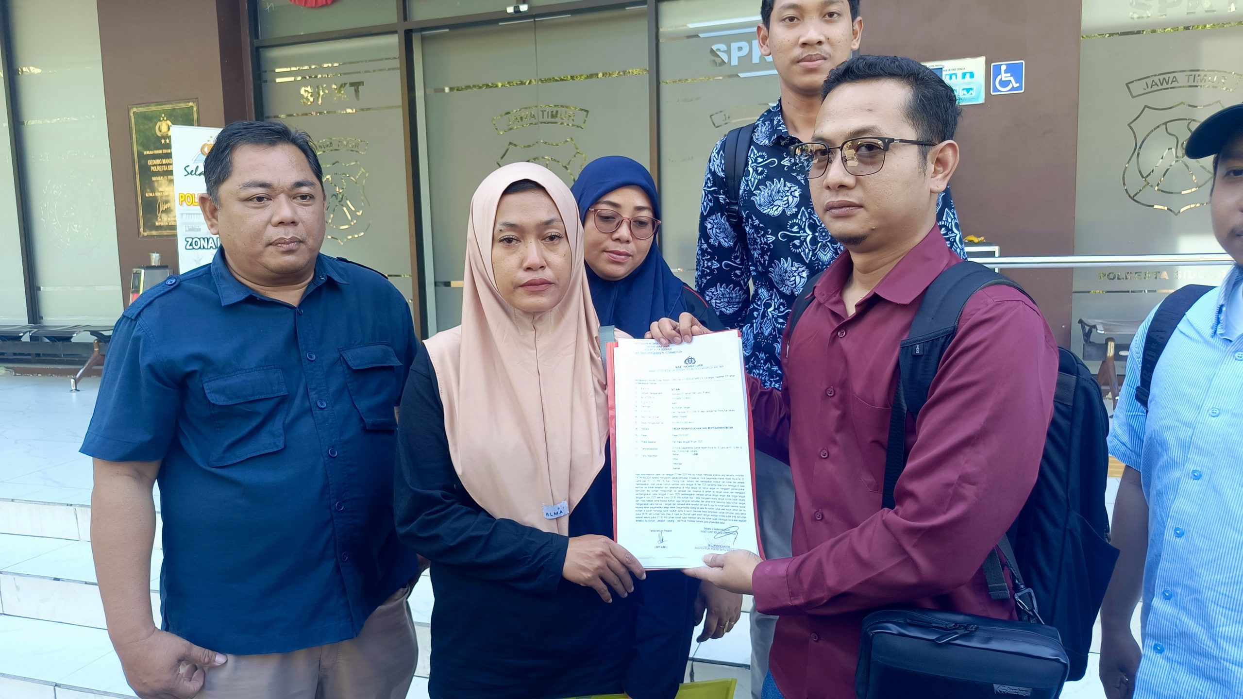 Siti Aini ibu korban balita Hanania didampingi kuasa hukum Frendy dari Lembaga Bantuan Hukum Damar Indonesia serta Sigit Imam Basuki Ketua JCW mengadukan dan melaporkan kasus kematian anaknya tersebut ke SPKT Polresta Sidoarjo, Rabu (4/9/2025).