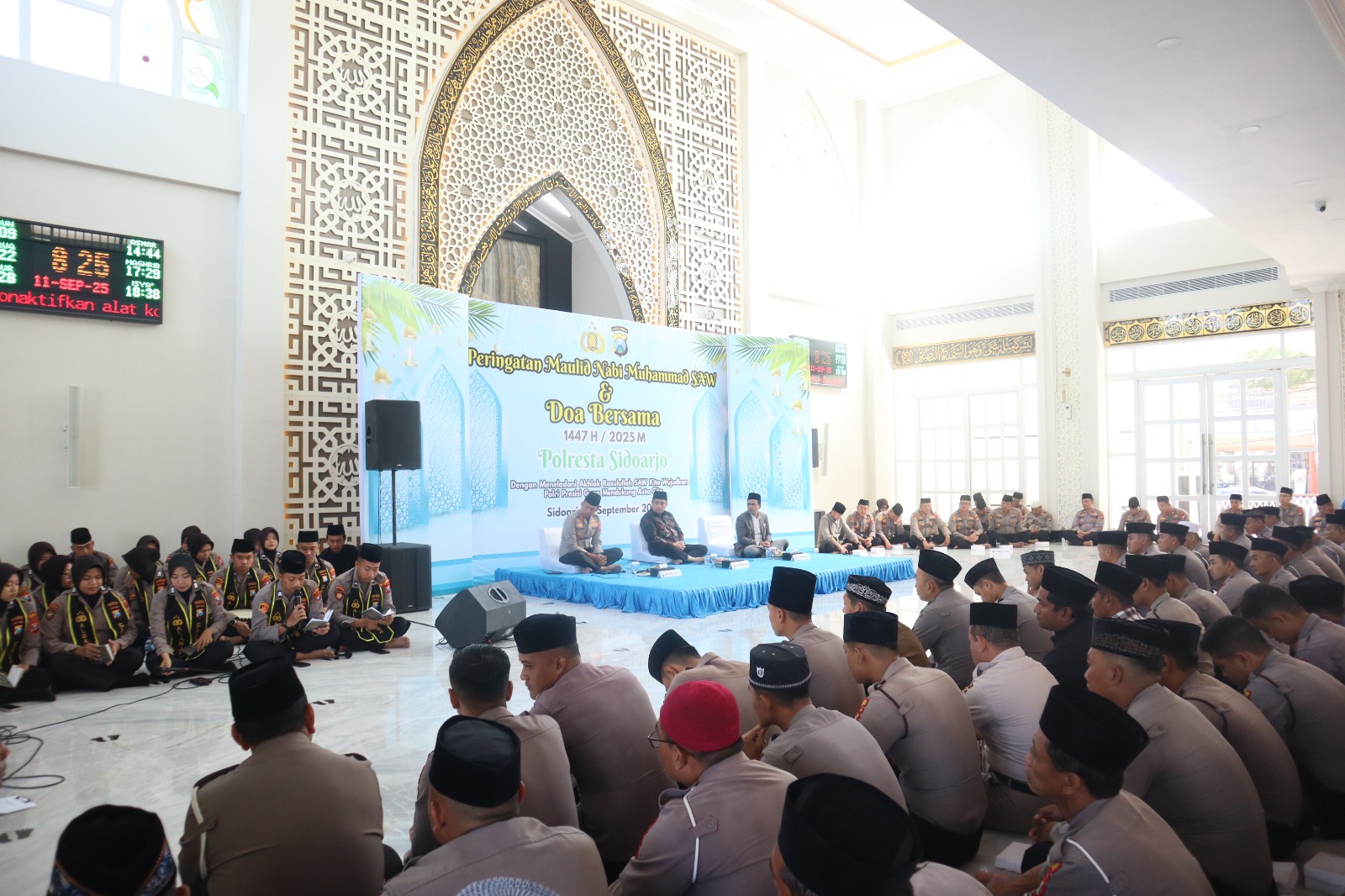 Zonajatim.com, Sidoarjo – Polisi merayakan Maulid Nabi Muhammad SAW 1447 H di Masjid Al Ikhlas Polresta Sidoarjo, Rabu (11/9/2025). Kegiatan yang diikuti Wakapolresta Sidoarjo AKBP Muhammad Zainur Rofik, anggota dan ASN ini di isi pembacaan shalawat Nabi, pengajian agama, doa bersama serta pemberian santunan kepada anak yatim piatu.