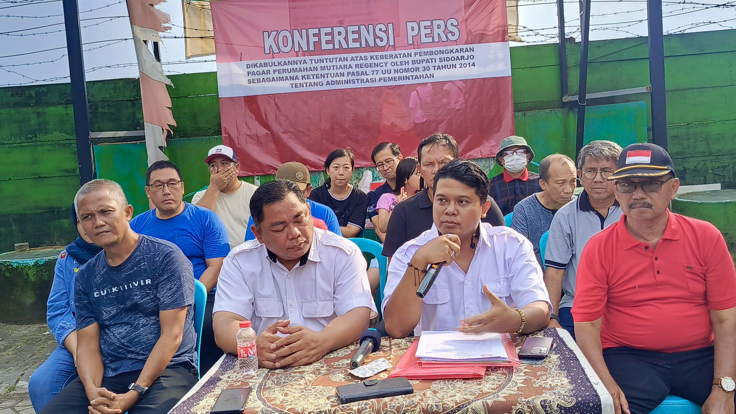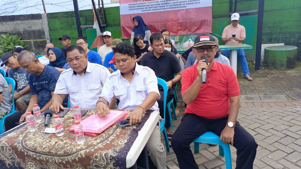 Kuasa hukum warga Perumahan Mutiara Regency, Urip Prayitno, SH, MH mengatakan hingga batas waktu yang ditentukan undang-undang, tidak ada tindak lanjut atau keputusan dari Bupati Sidoarjo atas surat keberatan yang diajukan pihaknya.“Sejak surat keberatan kami sampaikan pada 31 Desember 2025 hingga 15 Januari 2026, tidak ada respons apa pun. Karena telah melewati tenggang waktu 10 hari kerja, maka sesuai Pasal 77 ayat (5), keberatan kami dianggap dikabulkan secara hukum sesuai UU,” kata Urip didampingi Suhartono, Ketua RW dan puluhan warga Mutiara Regency, Jumat (16/1/2026).