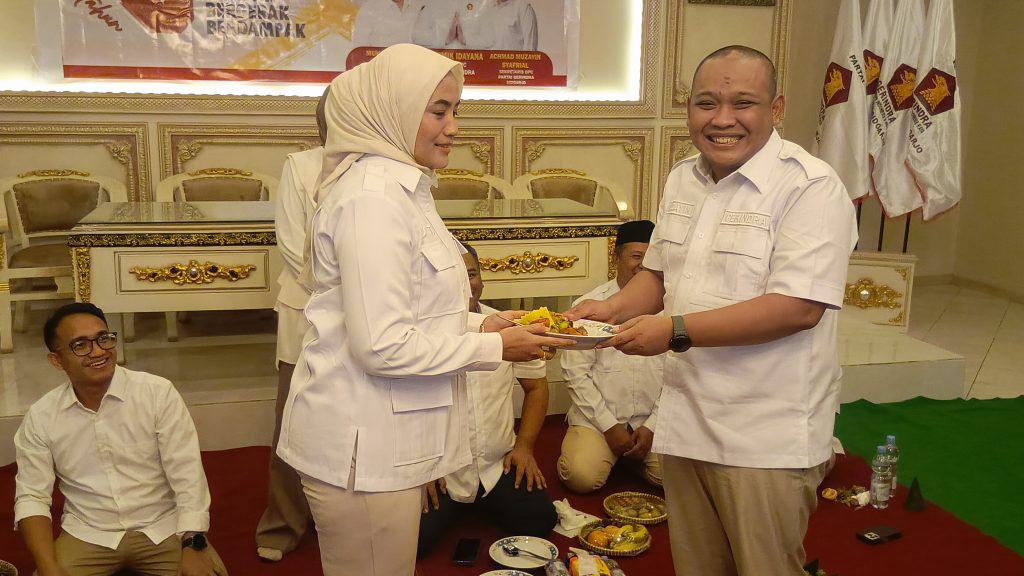Muzayin Sekretaris DPC Partai Gerindra serahkan tumpeng ke Ketua PIRA Rachmawati Saputri