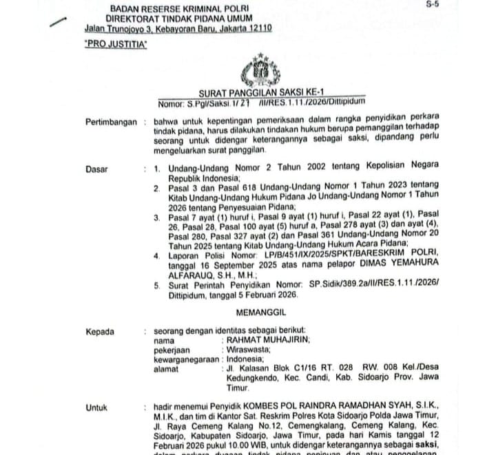Zonajatim.com, Sidoarjo – Pasca penyerahan SPDP dugaan kasus penipuan dan enggelapan Rp 28 miliar dengan terlapor Subandi SH, MKn (Bupati Sidoarjo) dan putranya bernama M Rafi Wibisono (Anggota DPRD Sidoarjo) ke Jampidum Kejagung 5 Februari 2026, Bareskrim Mabes Polri tancap gas memeriksa pelapor dan sejumlah saksi terkait SPDP tersebut.