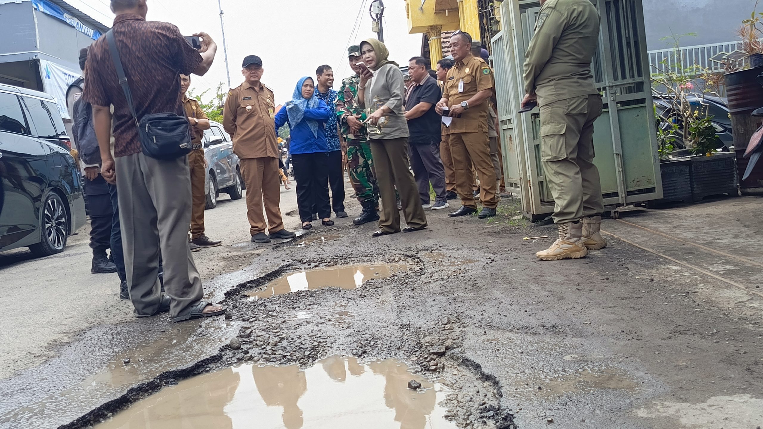 Di lokasi, Wabup Mimik melihat sendiri kubangan cukup besar di tengah badan jalan yang dipenuhi genangan air hujan.