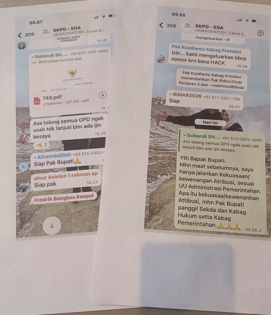 Dalam chat grup WA SKPD Sidoarjo, Bupati Subandi menampilkan surat Wabup Mimik Idayana tersebut dan meminta “semua OPD tidak usah menindaklanjuti karena belum ada ijin dari saya.” Atas perintah Bupati Subandi, sejumlah OPD langsung menjawab “Siap Pak”.