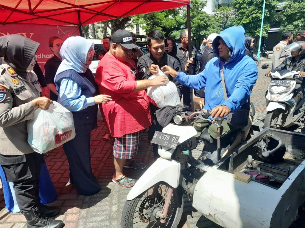 Sebanyak 2.600 paket bingkisan lebaran, sebagian besarnya dibagikan secara langsung di dekat kantor DNY Skincare, di Bundaran Taman Paris Perum Puri Surya Jaya Gedangan, Sabtu (14/3/2026).