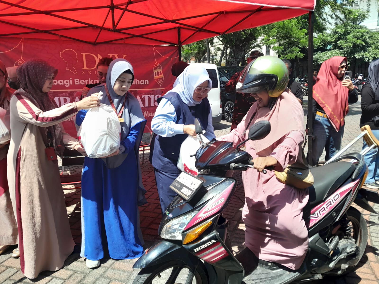 Owner DNY Skincare Deny Rachmawati dan Trimunas Prijanto tampak ikut langsung membagikan bingkisan lebaran tersebut.