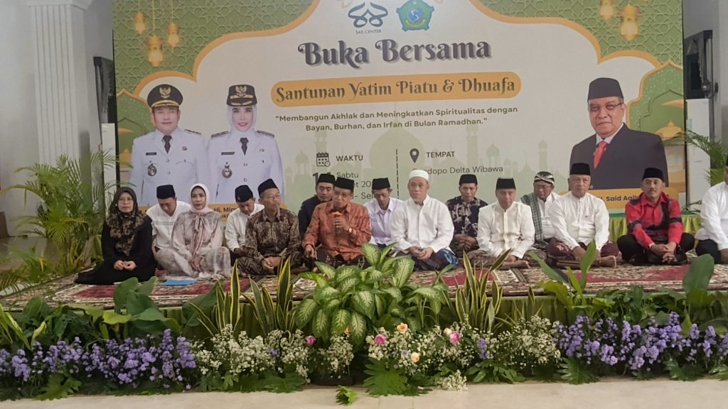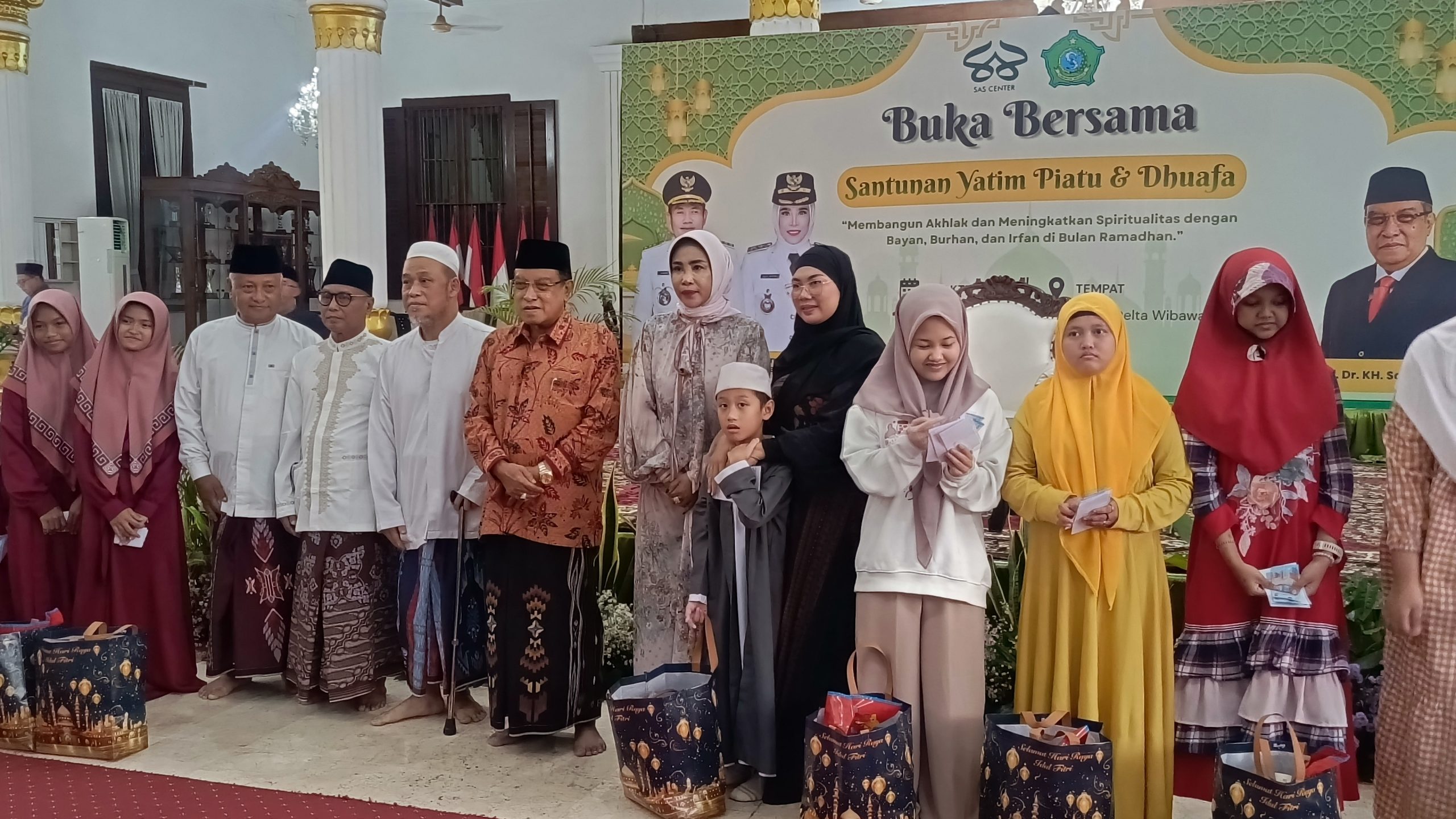 Wakil Bupati Sidoarjo Mimik Idayana mendampingi ulama kharismatik KH Prof Said Aqil Siradj dalam kegiatan santunan kepada ratusan anak yatim piatu dan dhuafa yang digelar di Pendopo Delta Wibawa, Sabtu (14/3/2026).