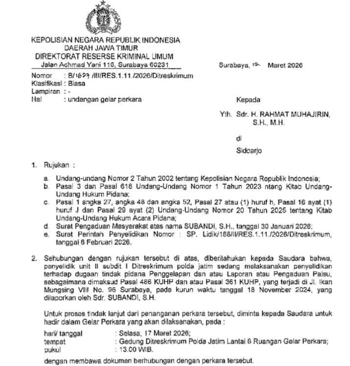 Berdasarkan surat resmi bernomor B/1699/III/RES.1.11/2026/Ditreskrimum tertanggal 12 Maret 2026, penyidik mengundang pihak-pihak terkait untuk hadir dalam gelar perkara yang digelar di Mapolda Jatim.