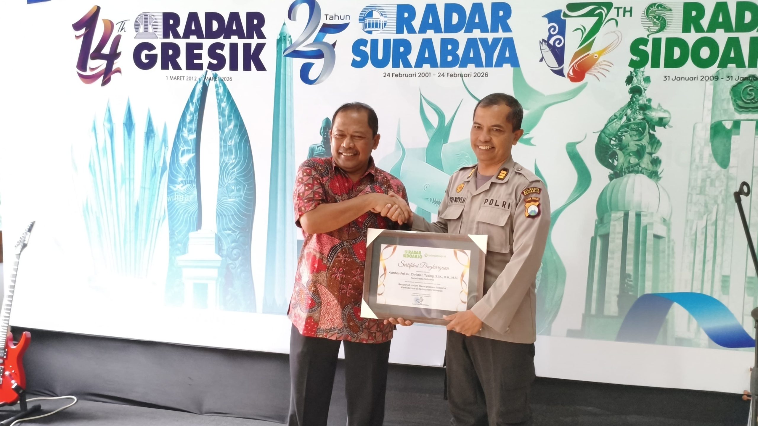 Penghargaan tersebut diserahkan oleh Direktur Radar Surabaya, Lilik Widyantoro, kepada Kasi Humas Polresta Sidoarjo AKP Tri Novi Handono yang hadir mewakili Kapolresta Sidoarjo. Penyerahan berlangsung dalam acara Halal bi Halal sekaligus peringatan ulang tahun Radar Surabaya, Sidoarjo, dan Gresik, Selasa (31/3/2026), di kawasan Kembang Jepun, Surabaya.